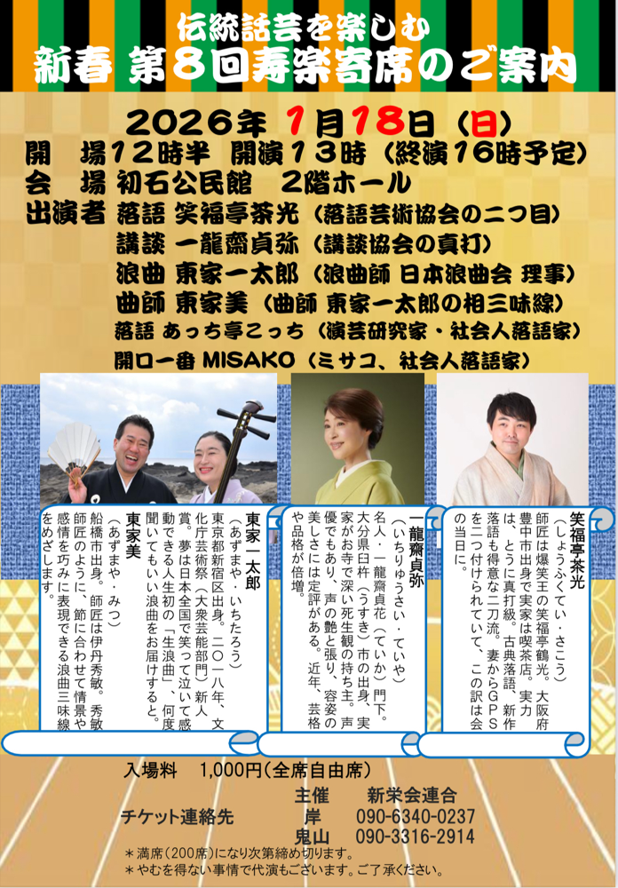 浪曲の東家一太郎・美、講談の宝井琴凌、落語の柳家小はぜによる会です