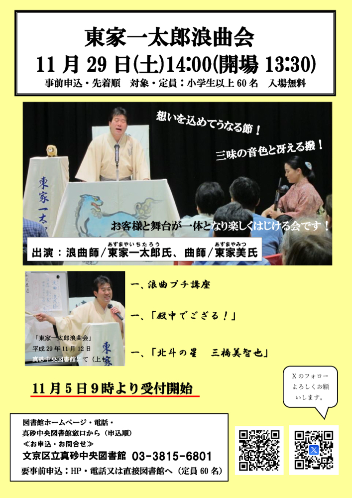 明後日 11月29 日(土) 14時~ 文京区立真砂中央図書館地下ホール 本郷三丁目駅最寄り 東家一太郎 東家美 浪曲会 ・忠臣蔵のはじまり「殿中でござる!」 ・ 「北斗の星 三橋美智也」 津島唯々作 務めます 入場無料・事前申込です ↓からまだ申し込みできると思います rokyoku.com/20251129live/ 文京区立 真砂中央図書館 毎年、東家一太郎・美 浪曲会を...