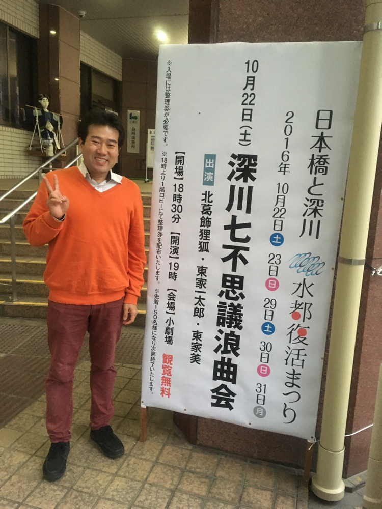『日本橋と深川 水都復活祭』の前夜祭 深川七不思議浪曲会にて 新作浪曲「深川怪談七不思議」を務めさせて頂きました。 ご来場頂きましたお客様、誠に有難うございました。 浪曲会の前には、 「妖怪はしわたし」というイベントがありまして、 日本橋から妖怪たちが乗った船「妖怪船」が深川までやって来ました。...