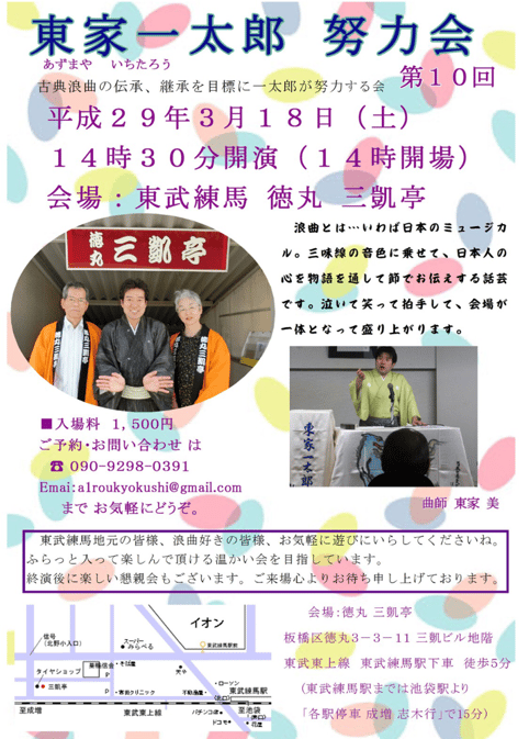 3/18土曜日 東武練馬三凱亭にて 東家一太郎努力会 第十回 を務めさせて頂きました。 ご来場頂きましたお客様、誠に有難うございました。 皆様のおかげで三凱亭さんでの一太郎浪曲会をはじめさせて頂きまして2年を越えました。 東武練馬お近くのお客様にもっと浪曲を楽しんで頂けます様、今後も輪を広げて行きたいと思っております。 次回は 5月21日...