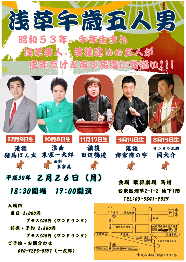 2月26日月曜日19時から 浅草午年五人男の会を歌謡劇場馬道にて開かせて頂きました。 寒い夜にもかかわらず、ご来場下さいましたお客様、誠に有難うございました。 番組は 岡大介 カンカラソング 東家一太郎 「浅草案内〜五人男紹介」曲師 東家美 田辺鶴遊 「豊竹呂昇」 〜仲入り〜 柳家喬の字 「元犬」 猪馬ぽん太 漫談 でした。...