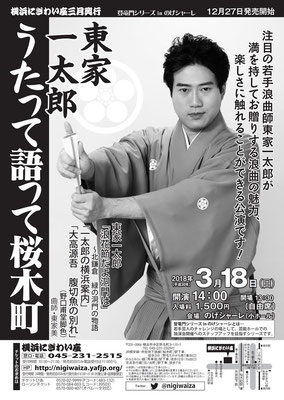3月18日日曜日横浜にぎわい座で14時開演の 「東家一太郎うたって語って桜木町」の情報を 2月17日(土)毎日新聞朝刊神奈川版27面のかながわ情報ランドに掲載頂きました(*^◯^*) 神奈川毎日広告社の方から新聞を送って頂きましたので写真を貼りますo(^o^)o にぎわい座ではじめての独演会です。 まだまだお席が沢山ございます。...