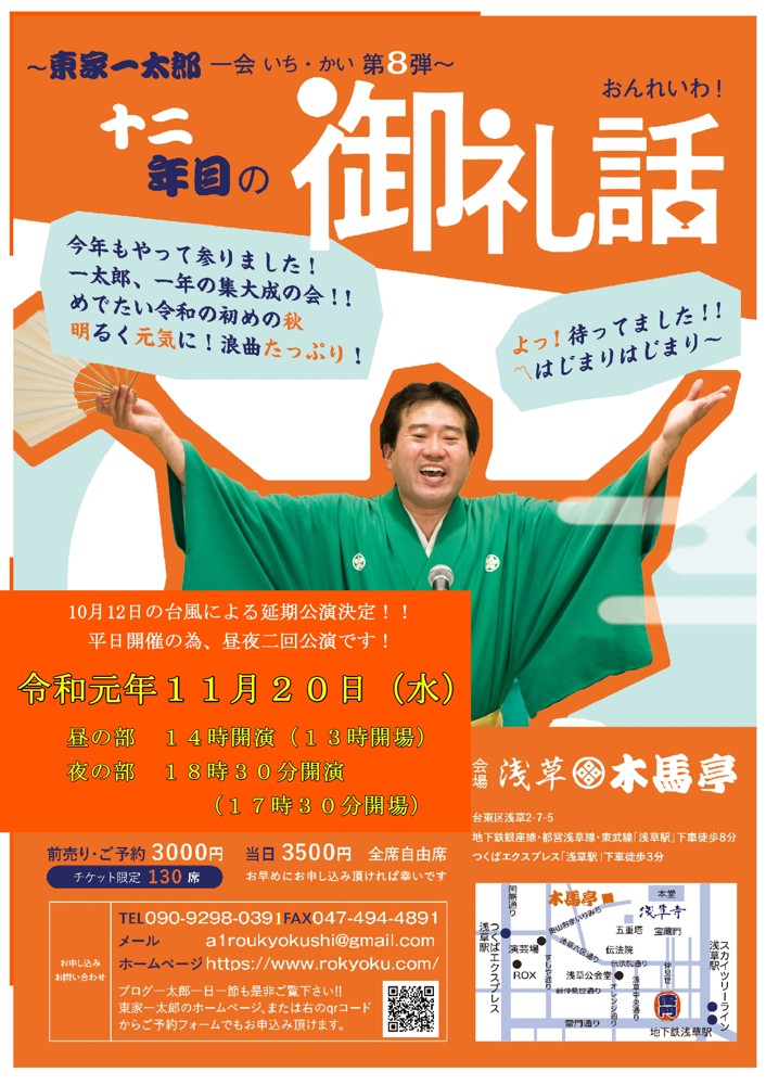 いよいよ明日11月20日水曜日 東家一太郎いちかい「十二年目の御礼話」延期公演です。 会場は浅草木馬亭。 ●昼公演 14時開演(13時開場) ●夜公演 18時30分開演(17時30分開場) です。 一日、2回の昼夜公演でございます! 夜公演はまだまだお席ございます。 昼公演もお入り頂けます。...