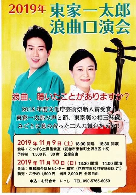 待ちに待ったる 岩手県花巻市東和町での 浪曲会がやってきました! 明日11月9日土曜日と10日日曜日です。 9日土曜日は 18時開場、18時30分開演 こっぽら土澤集会室 花巻市東和町土沢8区115 入場料 1500円 10日日曜日は 13時30分開場、14時開演 東和総合福祉センター和室 花巻市東和町安俵6区71 入場料 予約1500円、当日2000円 主催は こっぽら土澤の居心地最高の雑貨店...