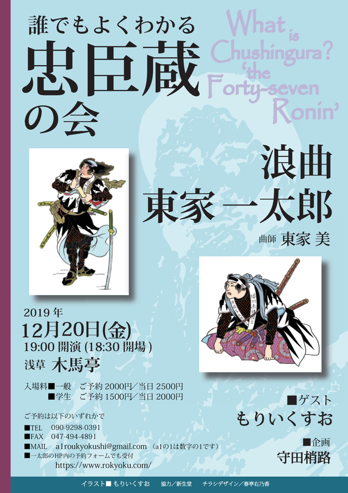各々方!いよいよ12月20日(金)19時開演 浅草木馬亭にて 「誰でもよくわかる忠臣蔵の会」を開催いたします!! 東家一太郎 曲師 東家美の浪曲三席プラス いったい忠臣蔵ってどういう話なのよ! どこが凄いの面白いの?忠臣蔵トークコーナーで タイトル通りの誰でもよくわかる忠臣蔵の会です! 企画は古典芸能エッセイストの守田梢路さん。...
