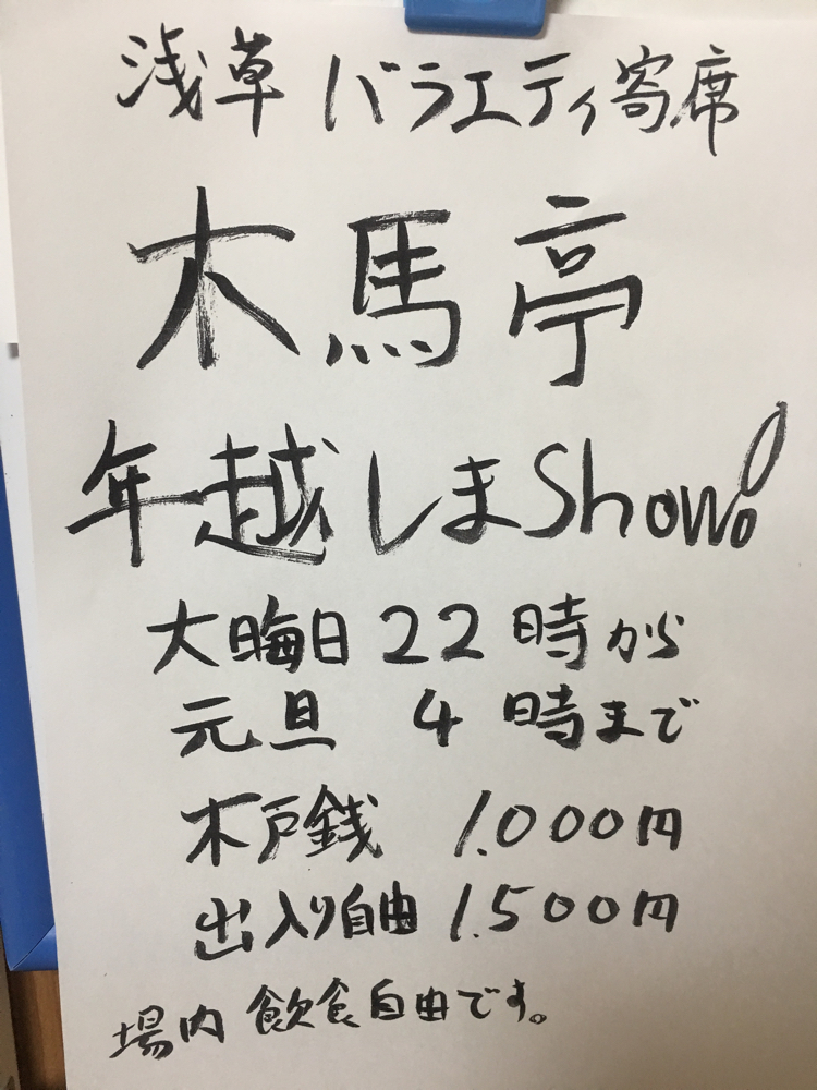 2019年から2020年へのカウントダウン‼️ 大晦日22時から元旦4時まで 浅草木馬亭での 浅草バラエティ寄席 木馬亭 年越しまshow❕ に東家一太郎 曲師 東家美 出演させて頂きます‼️ 浅草21世紀 関遊六さんの主催で 沢山の芸人さんや歌手の方が出演されます。 浅草寺に今夜初詣でにお越しの皆様 是非、木馬亭にお立ち寄り下さいませ。 木戸銭は1000円...