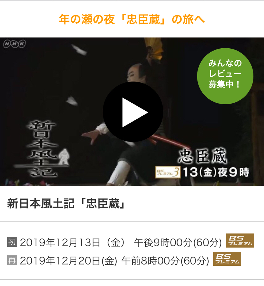 明日 12月20日(金) 朝8:00〜8:59 NHKBSプレミアムの番組 「新日本風土記 」忠臣蔵 再放送があります。 東家一太郎、美 取材して頂きました。 まず 番組の最初色んなシーンと共に そして後半の方で 登場シーンがございます。 浪曲定席浅草木馬亭の口演風景 浪曲協会広間で偶数月に開催しています 東家一太郎雷門会での 「大高源吾〜腹切魚の別れ」口演の様子と稽古風景...