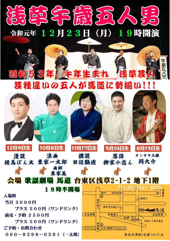明日 12月23日月曜 19時開演 浅草午歳五人男の会を 歌謡劇場馬道で行います‼️ 田辺鶴遊(講談) 柳家小志ん(落語) 東家一太郎(浪曲)東家美(曲師) 岡大介(カンカラ三線) 猪馬ぽん太(漫談) 昭和53年1978年生まれの浅草芸人 五人男が揃う毎年恒例の会です! 芸のジャンルは違っても、日本文化と芸能を背負う心は皆同じ!!...