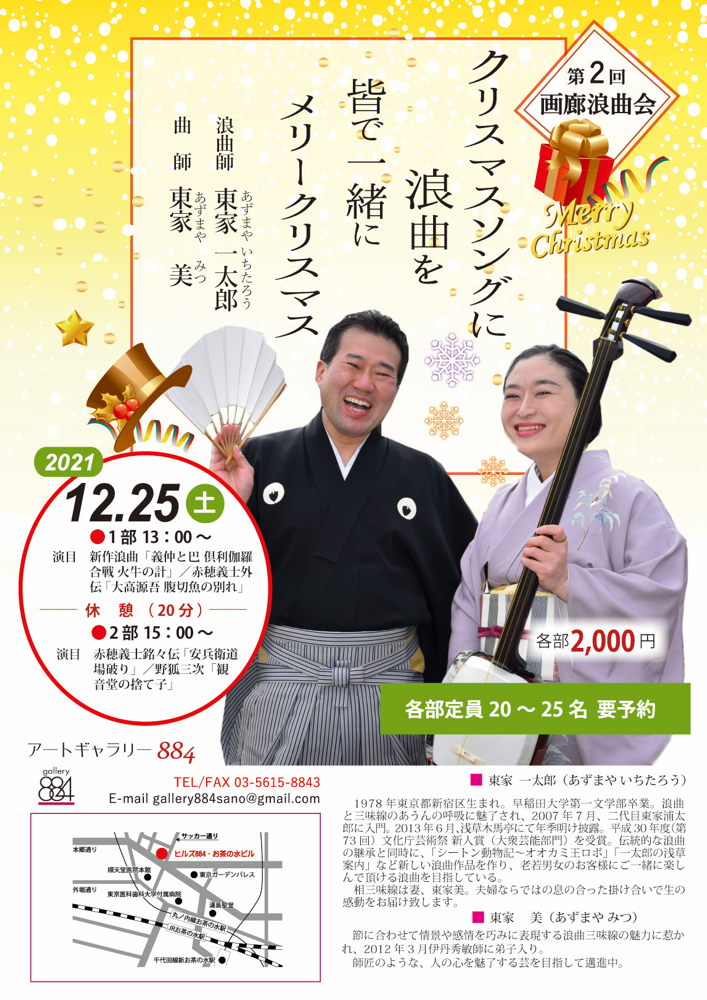 12/25(土) 今年最後の 東家一太郎・東家美の浪曲会 第2回 画廊浪曲会 クリスマスソングに浪曲を 皆で一緒にメリークリスマス お茶の水アートギャラリー884で開催頂きます! 第1部 13:00/第2部 15:00 お席まだございます。当日でも大丈夫です。ご来場お待ちしております! 節劇、無声映画と企画物の楽しい舞台が12月続きましたが がっつり一日で浪曲4席プラスα 第1部...