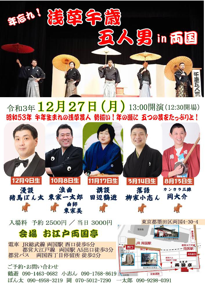 年に一回は必ず揃う! 浅草午歳五人男‼️ ウマが合う❗️ 昭和53年、午年生まれ 講談 田辺鶴遊先生 落語 柳家小志ん師匠 漫談 猪馬ぽん太さん カンカラ三線 岡大介さん 浪曲 東家一太郎 曲師 東家美 だけ酉年 毎年、五人男を楽しみにして下さっているお客様も沢山いらっしゃいます。 今年は お江戸両国亭で 13時の開演。 ひとりひとりたっぷり...