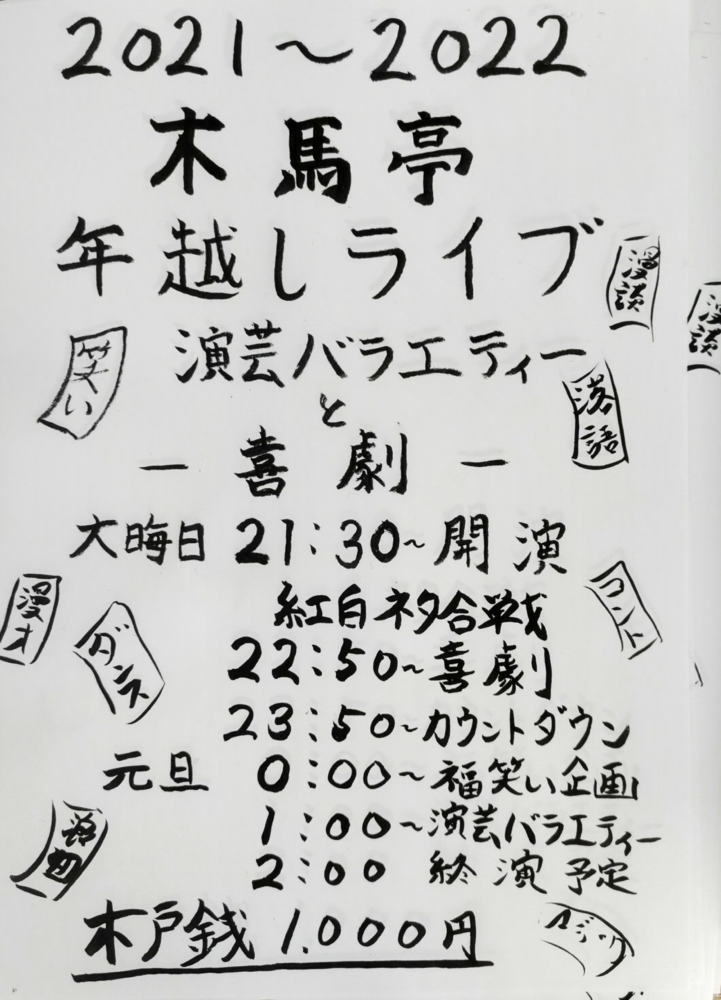 12月31日(火)21時30分開演 午前2時終演予定 浅草木馬亭での 「2021-2022 木馬亭年越しライブ」に 東家一太郎ピンで出演します! 何をやるかはお楽しみ 持ち時間10分 今年の最後に木馬亭 芸人としてこんなに有難いことはありません。