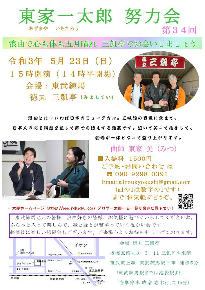 本日5月23日(日) 15時開演 東武練馬 三凱亭 「東家一太郎努力会 第34回」 予定通り開催いたします! 終演後の懇親会は今回は緊急事態宣言の為、お休みさせて頂きます。 浪曲二席、しっかりと物語をお伝えできますよう務めます。 お近くの方、お時間よろしい方は何卒宜しくお願い申し上げます。 皆様とお会いできますのを楽しみにしております! ◆...