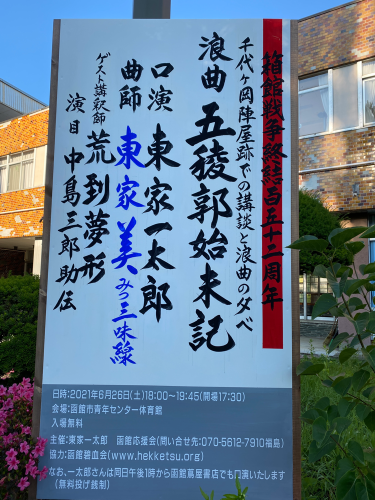 6/26土曜日 13時から 函館蔦屋書店での浪曲会 2階イベントスペースにお集まり下さいましたお客様、 誠に有難うございました! 一、浪曲プチ講座 一、安兵衛道場破り 一、五稜郭始末記 を務めさせて頂きました。 18時からは 千代台にある函館市青年センター体育館での浪曲会。 こちらも夜にもかかわらず沢山のお客様にいらして下さぃした。 心より御礼申し上げます。...