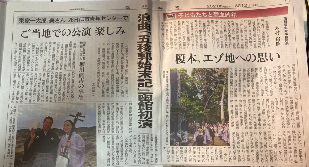 今日は、 来週の函館公演のスケジュールを立てていましたら アッという間に時が経ちました。 送って頂いた先日の函館新聞の記事。 浪曲会の記事の隣りに 函館碧血会事務局長木村裕俊様の記事があり、 碧血碑慰霊祭の写真があります。 改めて写真で見て、碑前で浪曲を務めさせて頂けるかと思いますと、 魂を込めて務めなければと緊張感が満ちて来ました。...