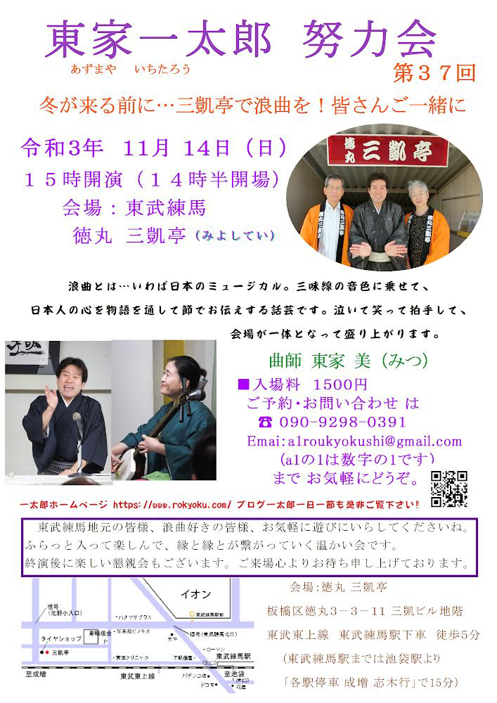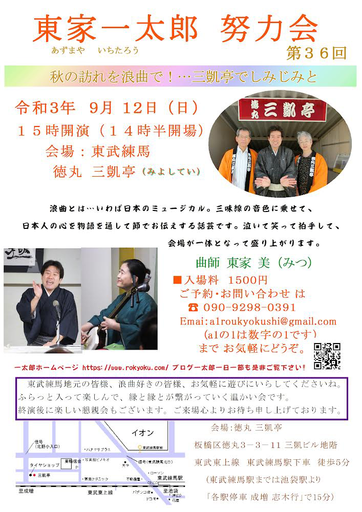 9月12日日曜日 東家一太郎努力会 東武練馬三凱亭にて開催させて頂きました。 ご来場下さいましたお客様、誠に有難うございました。 お客様の温かい御心に包まれながら 浪曲を務めさせて頂けまして本当に幸せです。 心より御礼申し上げます。 演目は 一、狸 一、野狐三次〜親子対面 浪曲 東家一太郎 曲師 東家美 でございました。 次回は 11月14日日曜日...