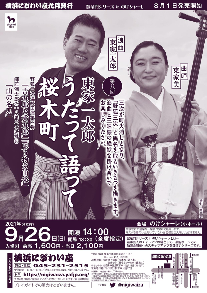 9月26日日曜日 14時開演 横浜にぎわい座 地下 のげシャーレ にて 「東家一太郎 うたって語って桜木町」 第8回公演 がございます。 チケット発売中です。 お求め頂けましたら幸いでございます。 野狐三次連続口演の第四弾 「吉五郎と秀五郎」(ネタ下ろし) 「彫り物の由来」 の二席と 「山の名刀」 を 曲師 東家美の三味線で務めます。...