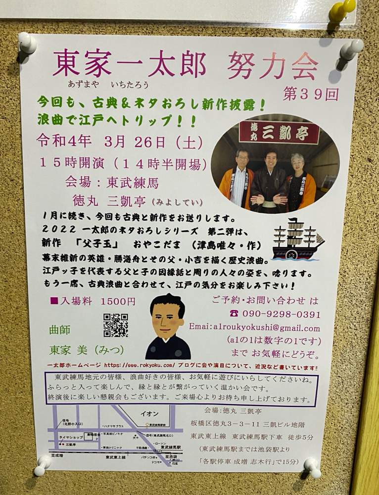 東武練馬 三凱亭に 3/26(土)東家一太郎努力会のチラシ置いて来ました(o^^o) 新作「父子玉」プラス古典一席 ご来場お待ち申し上げております! 三凱亭(みよしてい)は本当に素晴らしい寄席です‼️ 三凱亭で会を続けさせて頂いていることが本当に幸せです‼️ 席亭とお客様のお人柄ゆえです(^ω^)