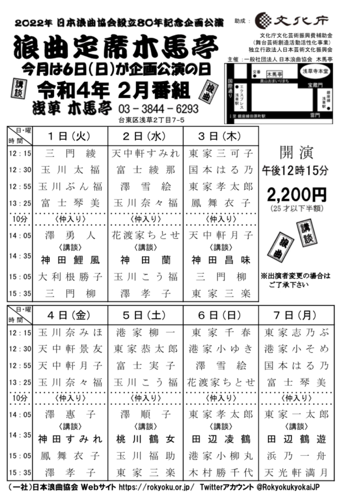 明日 2月7日(月) 12時15分開演 浅草 木馬亭 日本浪曲協会設立80周年記念 「浪曲定席木馬亭」 14時05分頃出演します! 浪曲のすべてが詰まった木馬亭。 ご来場お待ち申し上げております! 今年2022年の木馬亭定席は 【日本浪曲協会設立80年記念公演】 なんです!...