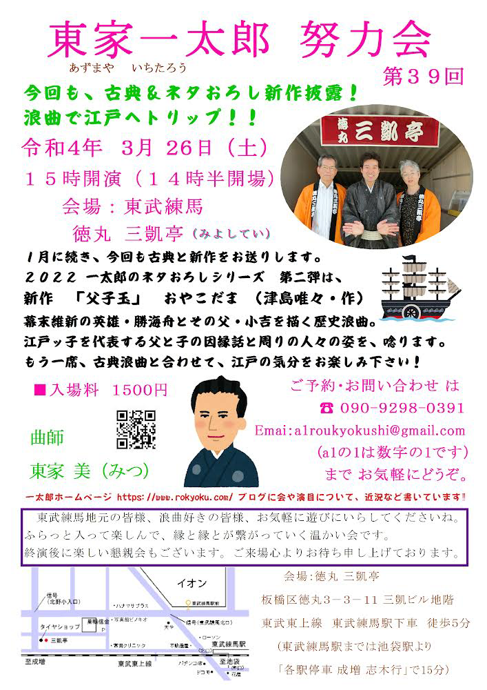 3月26日(土)15時開演の 東家一太郎 努力会 第39回 でネタ下ろしします 新作「父子玉(おやこだま)(津島唯々・作)。 幕末維新の英雄・勝海舟とその父・小吉を描く歴史浪曲です。 今日は日中、台本を読んで稽古をしました。 人物イメージや仕草で色々気になった所もネットで調べました。 勝小吉の自伝 「夢酔独言」原本が...