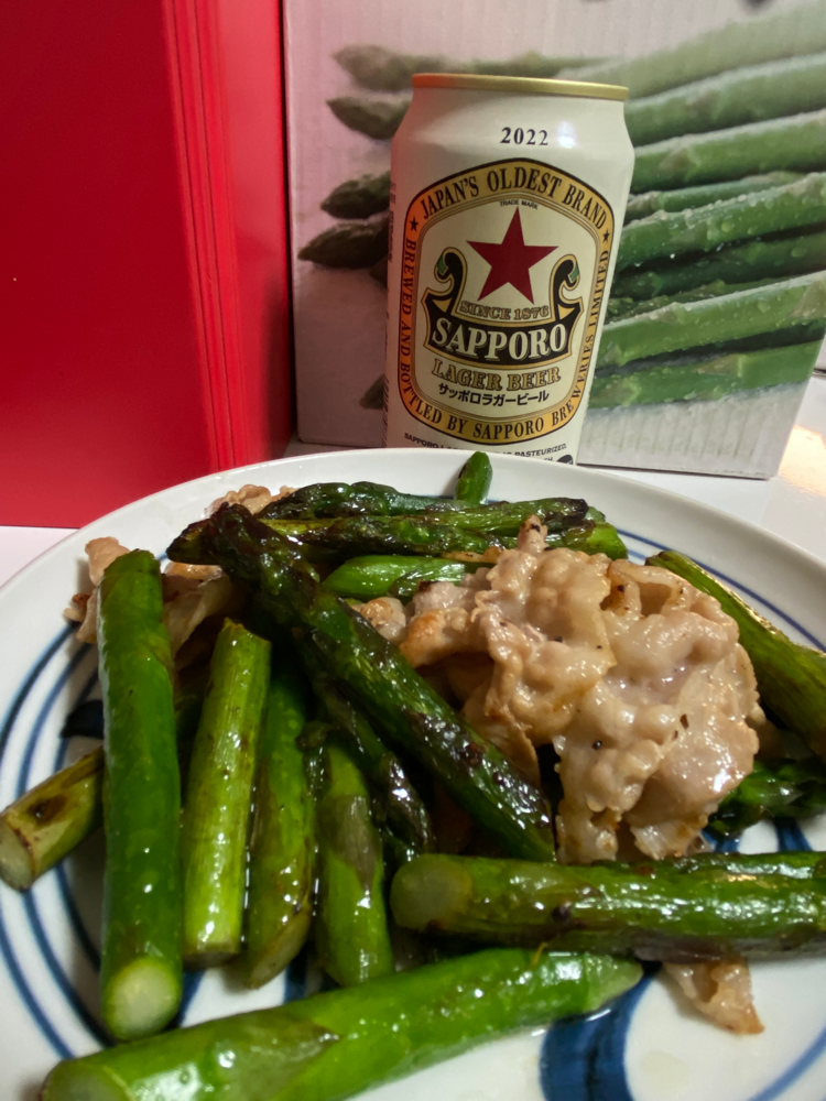 北海道産のアスパラガスを頂きました‼️ 北の大地の青々とした味、食感が最高です‼️ 豚バラ肉とバターたっぷり、黒胡椒多め、 アスパラたっぷり、強火で炒めて 最後に醤油を少しかけて 出来上がり(o^^o) ビールは勿論、サッポロビール。 ラガーの赤星にしました。 この前、初演しました 薩摩藩英国留学生、サツマ・スチューデントの...