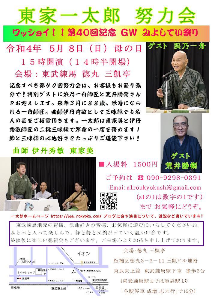 5/8(日)15時開演 東武練馬三凱亭 東家一太郎努力会は ワッショイ!!第40回記念 GW みよしてい祭り 特別ゲスト 浜乃一舟師匠と荒井勝衛さん 一舟師匠には曲師伊丹秀敏として三味線でも名人芸をご披露頂きます。  一太郎は秀敏師匠と東家美の二挺三味線で務めます! ゴールデンウィーク最終日 とにかくお祭り気分で お客様と 幸せな浪曲タイムを過ごしたいです!...