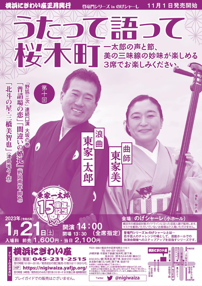 横浜にぎわい座 「第十回 東家一太郎 うたって語って桜木町」 明日1/21(土)14時開演です。 一太郎浪曲15周年記念! 野狐三次 大坂の巻 二席 北斗の星・三橋美智也 お席まだございます! 曲師 東家美 明日しか出来ない舞台です。 ご予約、ご来場お待ち申し上げております。 bit.ly/3ZtHUtp 野狐三次 普請場の恋...