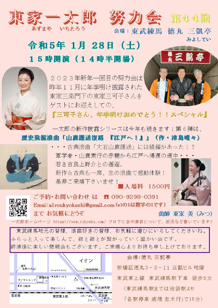 明日1/28(土)15時開演 東武練馬 三凱亭での 東家一太郎努力会第44回は 東家三可子さんをゲストにお迎えしての『三可子さん、年季明けおめでとう!!スペシャル』 たっぷり一席ご披露頂き、トークコーナーで三可子さんの浪曲への熱い想いを伺います! 一太郎は 「山鹿護送復路 江戸戻りの巻」 (作・津島唯々) 浪曲史上おそらく初のパロディ浪曲。...