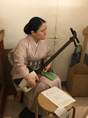 舞台袖で美が、落語の下座さんのように、張り切ってかけ声を掛けて弾いていました。