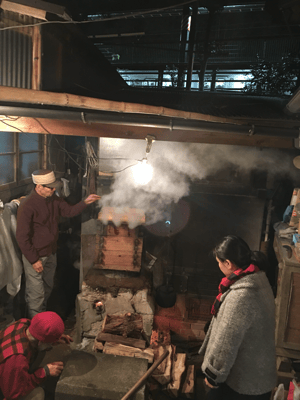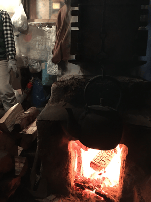 かまどに薪を入れて、お湯を沸かして、その上にせいろを乗せて餅米を蒸し、