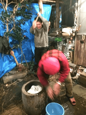 蒸しあがったら、臼に入れて、杵でまんべんなくすり潰してから、餅をつく。
