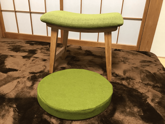 美の大好きな緑色の安定感抜群の椅子と、足置き用の低反発マット。