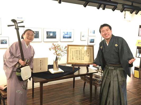 舞台横には文化庁芸術祭新人賞のトロフィーと賞状を飾らせて頂きました。