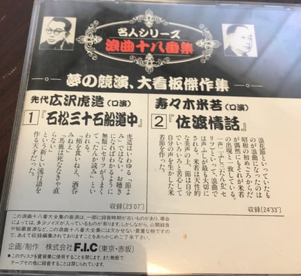 02日 5月 2020 7日間浪曲ジャケットカバーチャレンジ 5日目 7日間 浪曲ジャケットカバーチャレンジ 5日目 「夢の競演 浪曲十八番集」CD 株式会社 F I C 呑みねぇ、寿司食いねぇ、江戸っ子だってねぇ、神田の生まれよ の台詞で有名な 先代広沢虎造の清水次郎長伝「森の石松三十石船道中」 と 〽︎佐渡へ佐渡へと草木もなびく 佐渡は居よいか住みよいか 寿々木米若「佐渡情話」 昭和の浪曲、名人二人の夢の競演のCDです。 なかなかこのお二人を合わせて聴けるものはないと思います。 虎造 米若なしに浪曲は語れませんので入れさせて頂きました。 tagPlaceholderカテゴリ: 2020年5月 コメントをお書きください コメント: 0
