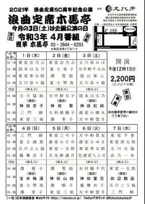 05日 4月 2021 木馬亭4/5御礼 4/5月曜日 木馬亭浪曲定席に出演致しました。 少し雨の降る日でしたが、 木馬亭にご来場下さいましたお客様、 誠に有難うございました。 東家一太郎 東家美の三味線で 「たにしの田三郎」 を務めさせて頂きました。 4/7水曜日の 木馬亭定席も出演致します。 夜になって、肌寒くなりました。 皆様くれぐれもご自愛下さいませ。 tagPlaceholderカテゴリ: 2021年4月 コメントをお書きください コメント: 0