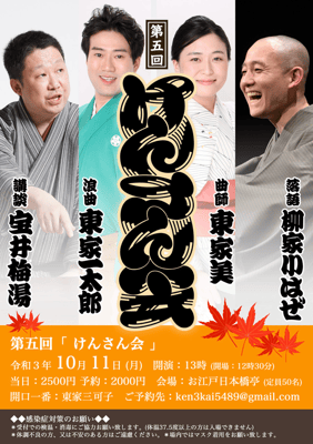 「けんさん会」とは浪曲の東家一太郎・講談の宝井梅湯・落語の柳家小はぜの若手三人による勉強会です。