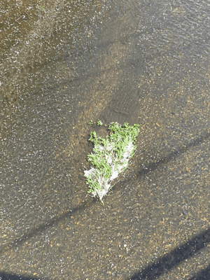 近くの川の草に桜の花びらが留まっていて、