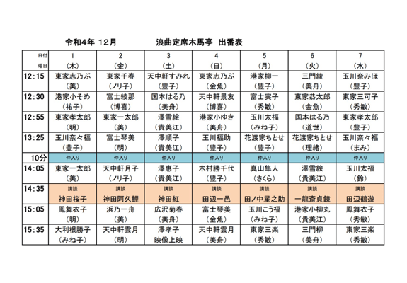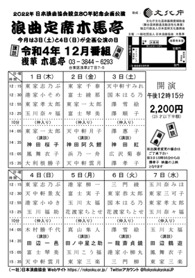02日 11月 2022 木馬亭定席 2022年12月 ◆ 12月1日(木)2日(金) 12時15分開演 浅草 木馬亭 日本浪曲協会設立80周年記念 「浪曲定席木馬亭」 毎月出演 1日は14時05分頃の出演 2日は12時55分頃の出演です。 木馬亭について詳しくはこちらをご覧下さいませ tagPlaceholderカテゴリ: 公演情報 コメントをお書きください コメント: 0