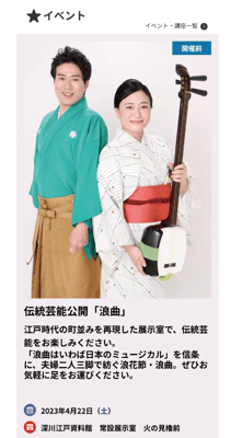 江戸の深川の町の中で聴く浪曲は雰囲気抜群です。