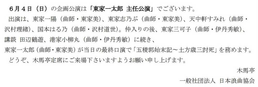 今後も定期的にトリを取らせて頂くことになります。大師匠東家楽浦から始まって、師匠東家浦太郎が愛した木馬亭定席。私自身、生の浪曲と出会い、入門してから育てて頂いた木馬亭を命のように愛しております。木馬亭で看板として成長して行けるように、演目も吟味して、芸を大きくして参ります。何卒宜しくお願い申し上げます。