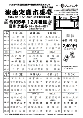 05日 12月 2023 明日12/6木馬亭定席トリです ご来場お待ちしております 明日12/6(水) 浅草木馬亭 浪曲定席 東家一太郎 曲師 東家美 トリを取らせて頂きます。 忠臣蔵、義士伝務めます❗️ 木馬亭は日本で唯一の浪曲の寄席です。 浅草観音様本堂から歩いて3分。 浪曲の殿堂、会場入るとそこは浅草ワンダーランド ご来場お待ち申し上げております‼️ tagPlaceholderカテゴリ: 2023年12月 コメントをお書きください コメント: 0