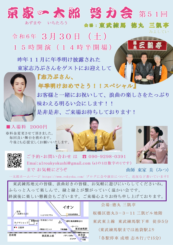 東武練馬お近くの皆様、浪曲好きの皆様、お気軽に遊びにいらして下さいね。