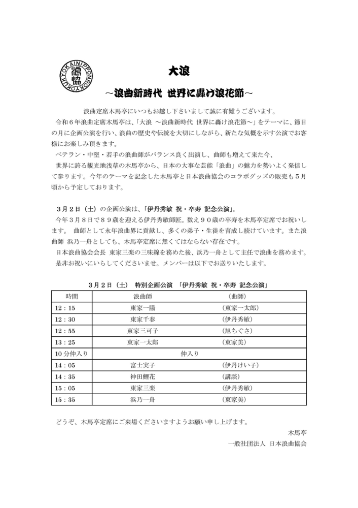 2024年のテーマ は「大浪 〜浪曲新時代 世界に轟け浪花節〜」