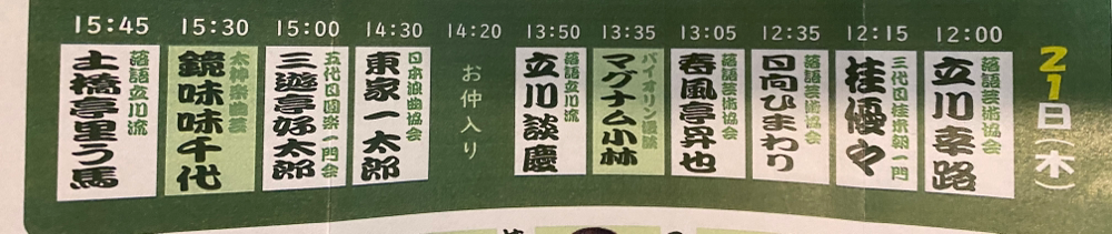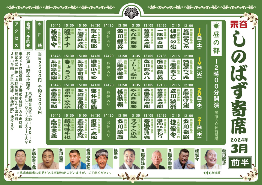 21日 3月 2024 永谷しのばず寄席 2024年3月21日 永谷しのばず寄席三月 3/21昼の部 日時:3月21日(木) 12:00開演 11:30開場 会場・予約:お江戸上野広小路亭 03-3833-1789 番組:立川幸路 桂優々 日向ひまわり 春風亭昇也 マグナム小林 立川談慶 仲入 東家一太郎 三遊亭好太郎 鏡味味千代 土橋亭里う馬 木戸:予約2000円 当日2500円 tagPlaceholderカテゴリ: 公演情報 コメントをお書きください コメント: 0