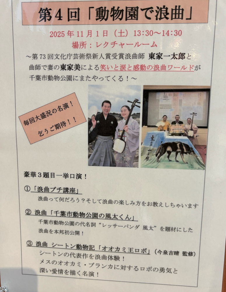 東家一太郎・美、大好きな千葉市動物公園で浪曲公演させて頂きます🌸