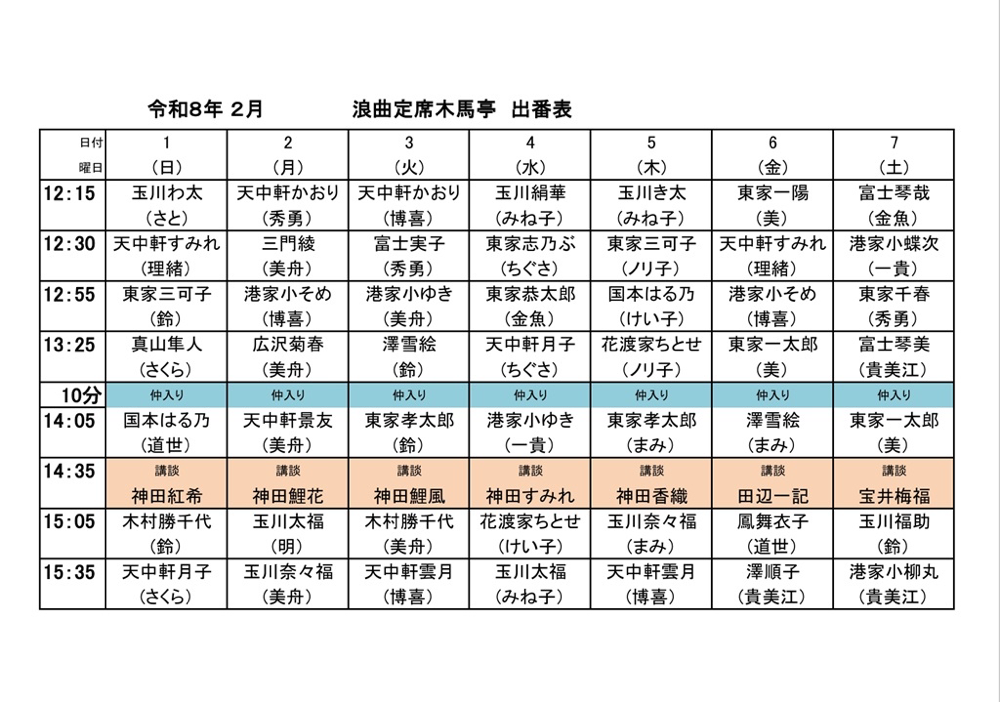 31日 12月 2025 浪曲定席木馬亭2026年2月 ◆ 2月6日(金)7日(土)12時15分開演 「木馬亭定席55周年」 会場:浅草 浪曲定席木馬亭 東家一太郎、曲師 東家美は 6日は13時25分頃、7日は14時05分頃の出演です。 木馬亭について詳しくはこちらをご覧下さいませ tagPlaceholderカテゴリ: 公演情報 コメントをお書きください コメント: 0